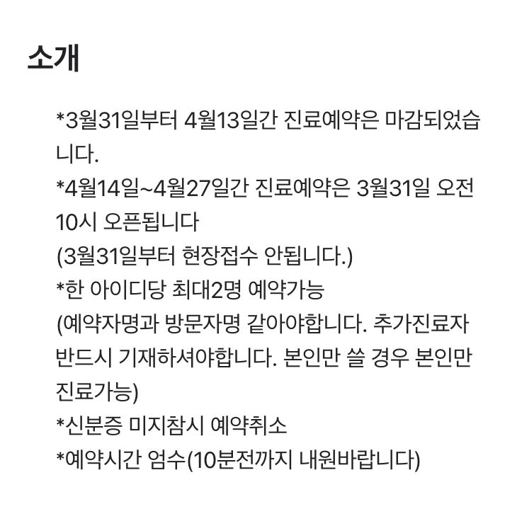- 주말 오전 진료는 선착순이므로 일찍 방문하는 것이 좋습니다.
