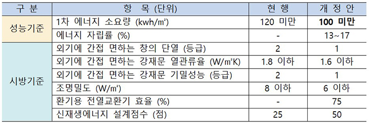 | 에너지 소비량 | 120㎾h/㎡yr 미만 | 100㎾h/㎡yr 미만 | 16.7% 향상 |