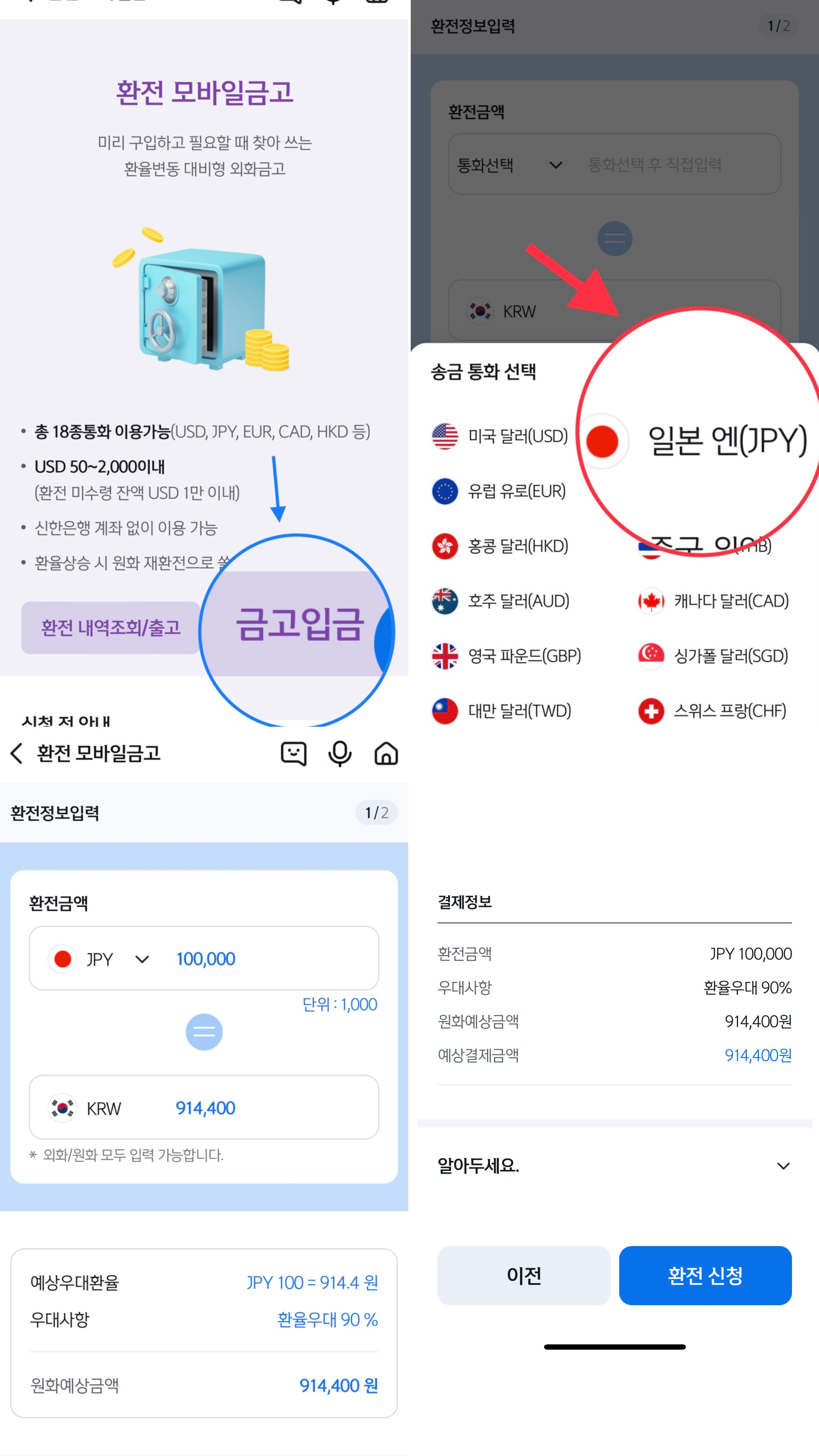 그럼 금고입금 버튼을 눌러 송금 통화인 일본 엔(JPY) 선택하시고