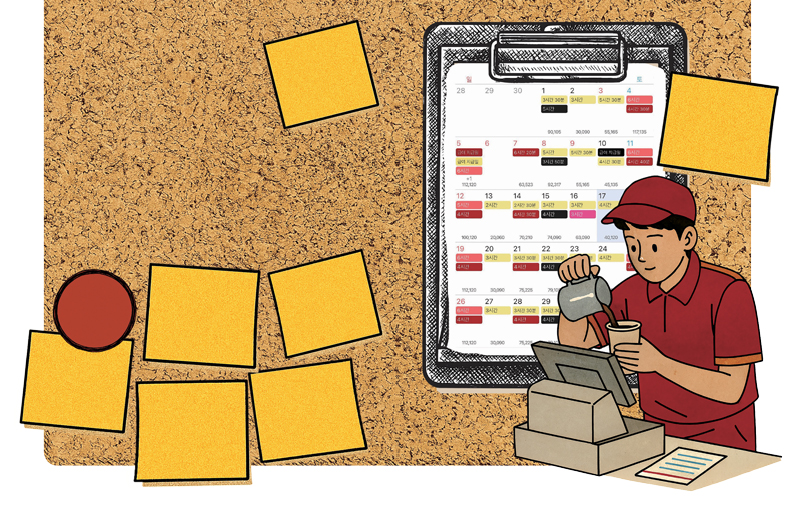 청년 A씨는 잘게 쪼개진 아르바이트 시간표 속에서 살아가고 있다. 그는 한 카페 프랜차이즈에서 월요일부터 금요일까지 매일 2~4시간 근무한다. 1주일 근무 시간은